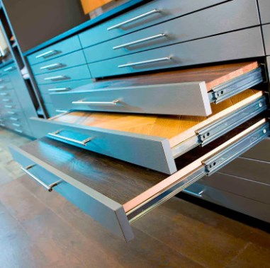 Çekmece slaytları, çekmecelerin pürüzsüz ve sessizce açılıp kapanmadığını belirleyin. Yüksek kaliteli slaytlar tipik olarak üç bölümlük bir tasarıma sahiptir ve çekmecelerin kolay erişim için tamamen uzatılmasını sağlar. Tipik olarak, gelişmiş korozyon direnci için elektroliz veya sprey kaplı bir yüzeye sahip soğuk haddelenmiş çelikten yapılmıştır. Sönümleme veya ribaund fonksiyonları olan slaytlar da popülerdir. Sönümleme slaytları, çekmecelerin nazikçe kapanmasına izin vererek sıkıştırmayı önler; Ribaund slaytları, çekmeceli panelde bir ışık basarak otomatik olarak dışarı çıkarak tutamak kurulumu ihtiyacını ortadan kaldırır ve kabinin temiz görünümünü artırır.